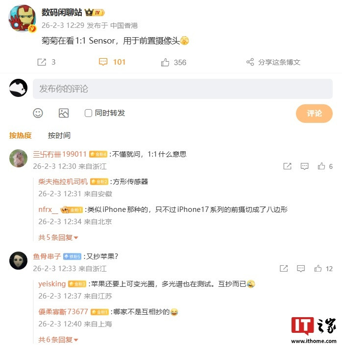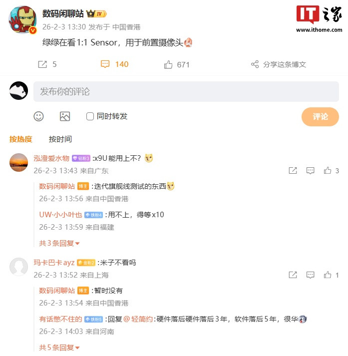IT之家注意到,博主今日继续爆料,称“绿绿”(此处预计代指OPPO)也在看1:1方形传感器,用于前置摄像头。有网友询问OPPOFindX9Ultra能否用上这款传感器,博主表示:“迭代旗舰线测试的东西。”还有网友询问小米是否在看该传感器,博主回复称:“暂时没有。”